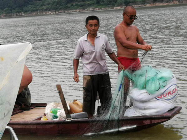 鹤龄镇畜牧兽医站站长兼执法中队长苟宗兵身先士卒,收缴非法捕鱼网,要求他们尽快将三无船只拖离嘉陵江水域,上岸进行彻底报废处理。